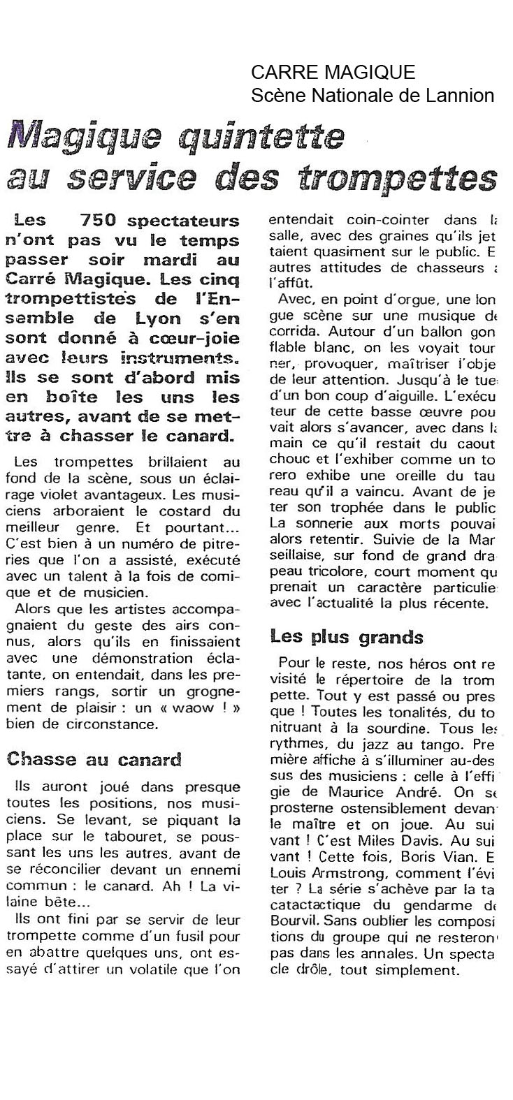 Créé en 1989, l'Ensemble de Trompettes de Lyon poursuit depuis 15 ans un itinéraire original qui dépasse le simple cadre du récital classique.